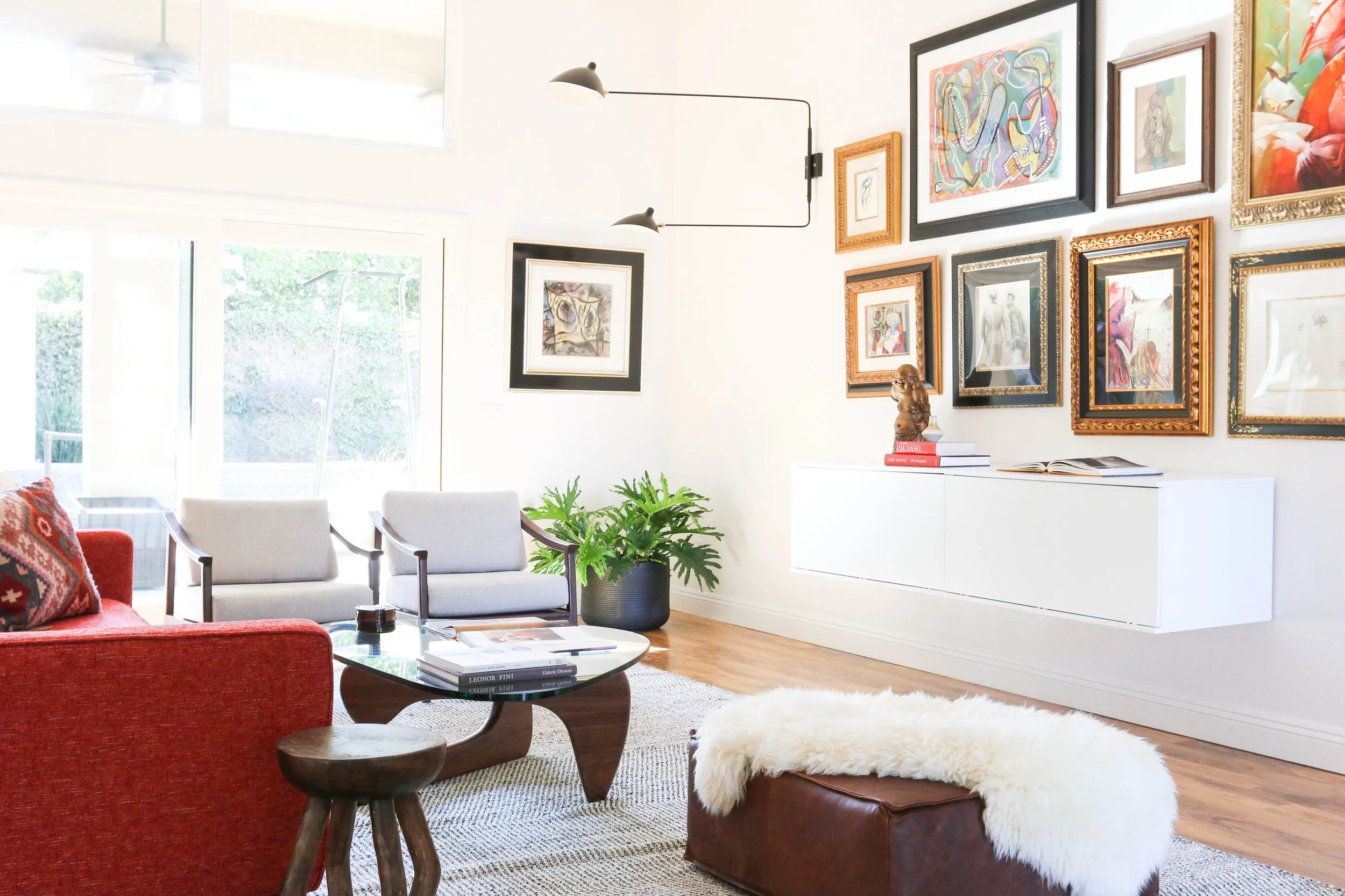 In this residential endeavor, midcentury furniture dances alongside a vibrant color palette, choreographing an inviting space that exudes joy and vitality. Each element thoughtfully curated to evoke a sense of playfulness and upliftment. Unexpected paintings and sculptures serve as whimsical accents, infusing the environment with a delightful sense of intrigue and wonder. The result is a home that not only embraces timeless elegance but also celebrates the exuberance of modern living. Step inside and experience a world where every corner is a delightful discovery waiting to unfold.